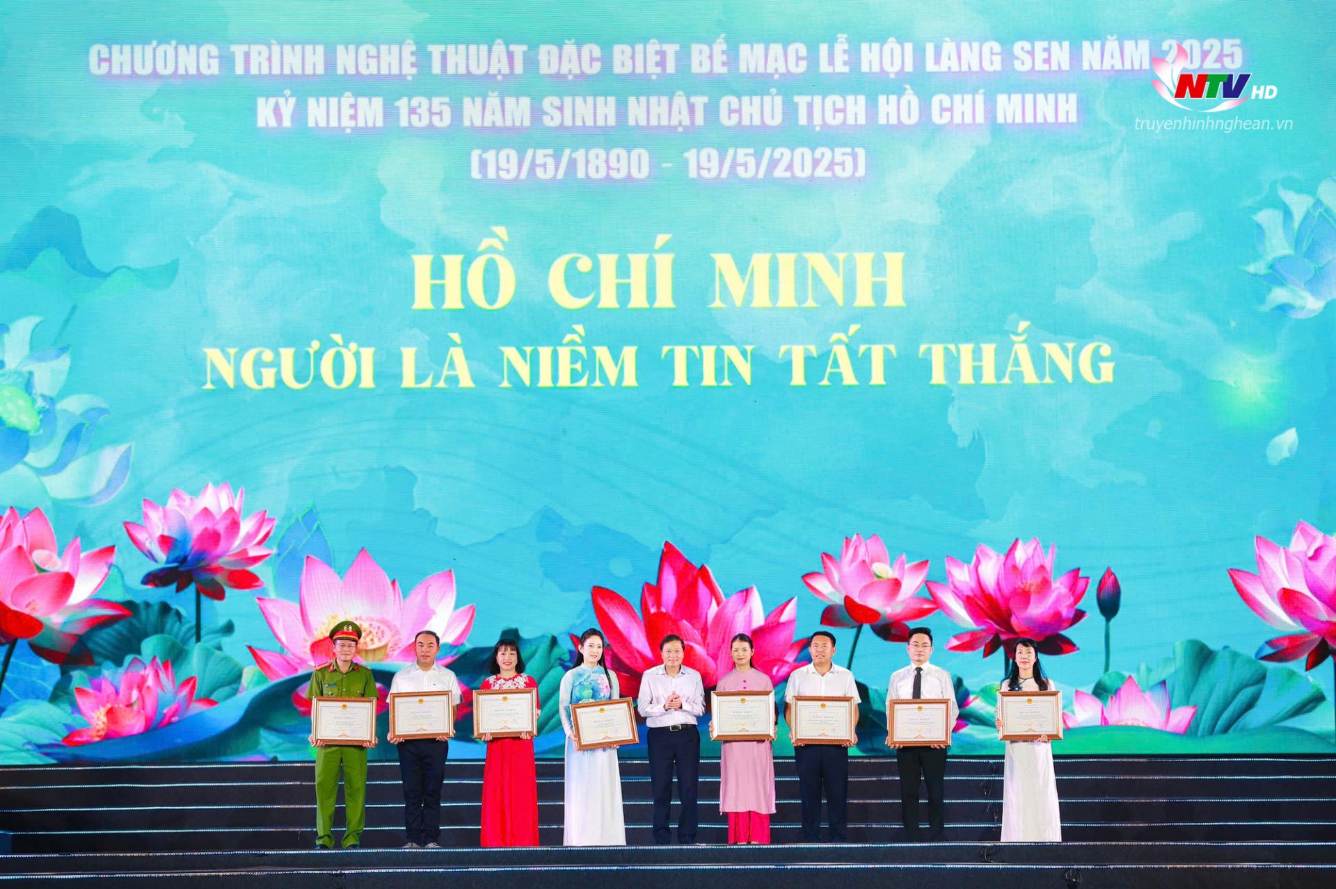 Ghi nhận những đóng góp của nhiều tập thể, các đơn vị khắp mọi miền đất nước cùng tạo nên thành công của Lễ hội Làng Sen năm 2025 và khánh thành tượng “Bác Hồ về thăm quê” chào mừng kỷ niệm 135 năm ngày sinh Chủ tịch Hồ Chí Minh, tại buổi lễ, UBND tỉnh Nghệ An đã trao tặng Bằng khen cho các đơn vị có thành tích xuất sắc trong việc tham gia, tổ chức, và lan toả giá trị nhân văn của lễ hội.