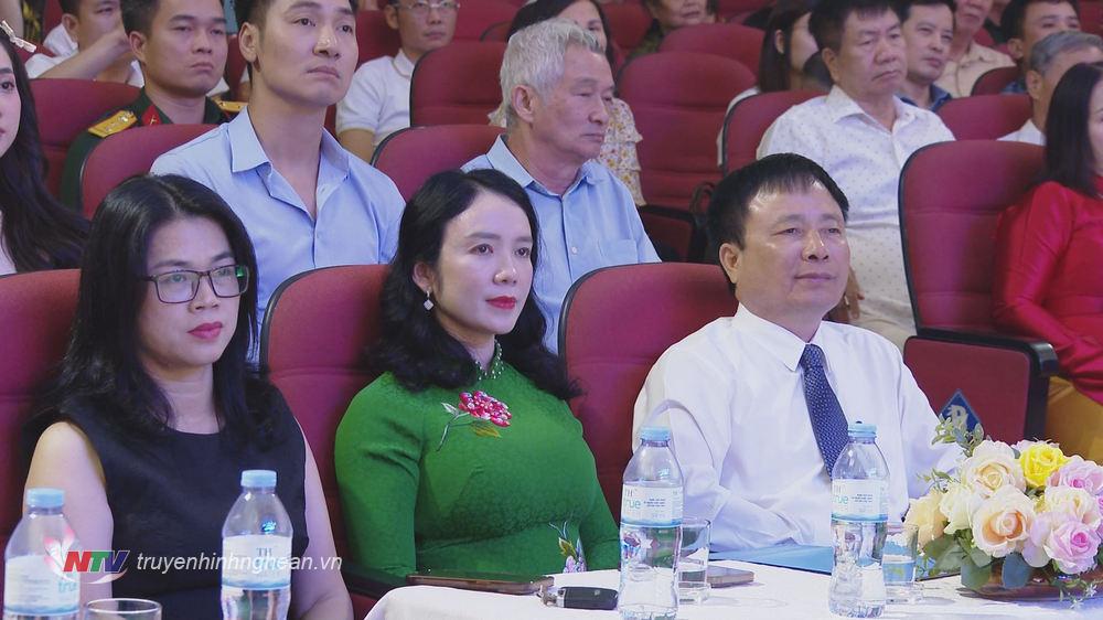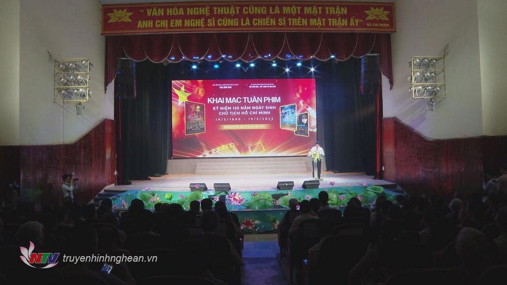 | Cục trưởng Cục Điện ảnh (Bộ VHTTDL) cùng đại diện lãnh đạo tỉnh Nghệ An, các nghệ sĩ, đoàn làm phim tại chương trình khai mạc. |