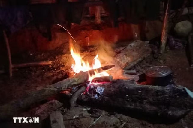 | Bếp lửa dã chiến được thắp sáng suốt đêm vừa để nấu thức ăn, giữ ấm cho mọi người và xua đuổi côn trùng, thú rừng. (Ảnh: Xuân Tiến/ TTXVN) |