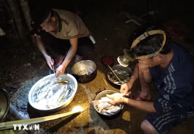 | Thành viên đoàn tuần tra rừng sơ chế cá suối trong đêm để nướng, làm thực phẩm dự trữ cho mọi người trong chuyến đi dài ngày. (Ảnh: Xuân Tiến/TTXVN) |