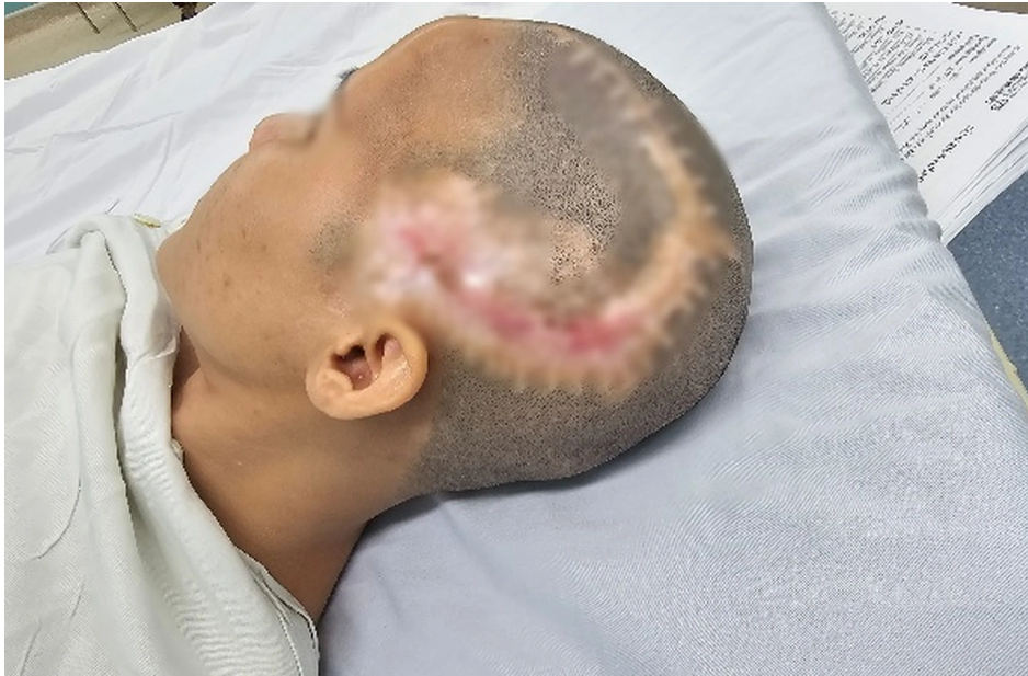 Hai tháng sau, bệnh nhân được thực hiện phẫu thuật vá màng sọ, cắt bỏ sẹo giãn diện rộng 90cm², lấy túi và chuyển vạt da đầu có tóc che phủ vùng khuyết.