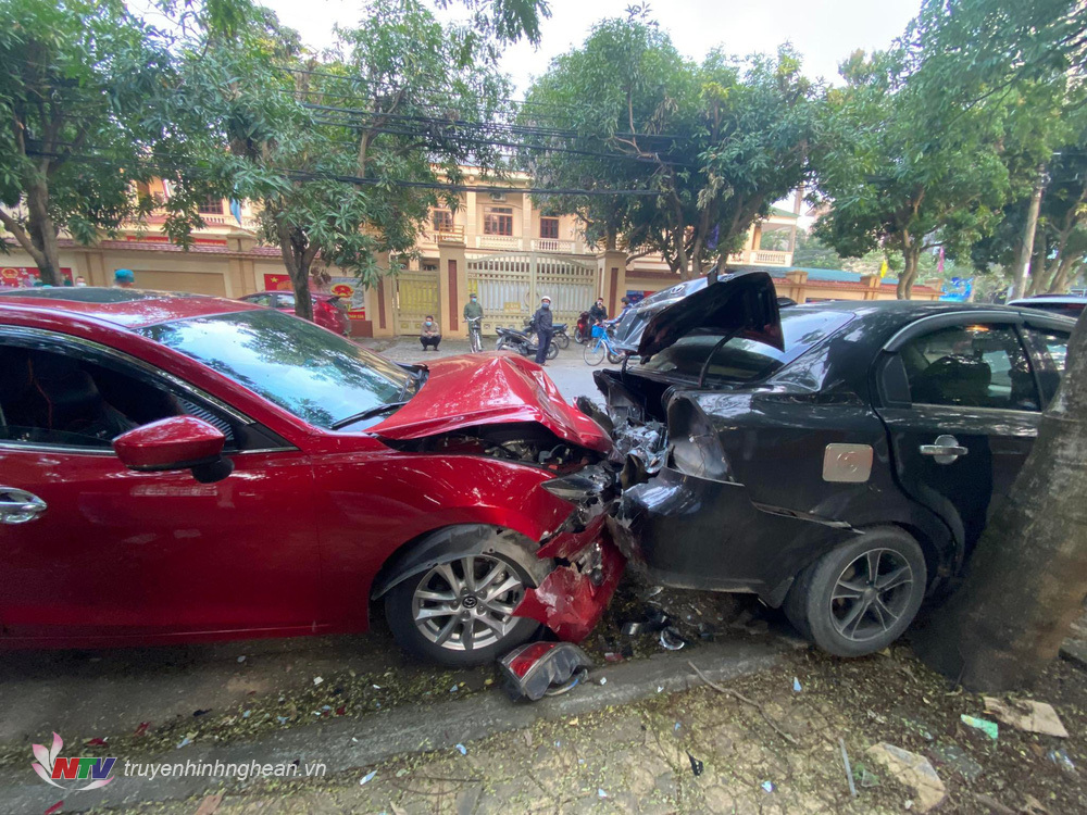 Bên phải đầu xe ô tô bị cắm vào lan can sắt, đèn và cản trước bay bung khỏi xe. Riêng 2 bánh xe và trục nối liền giữa 2 bánh văng rời khỏi xe. Mặt đường dưới gầm xe xăng dầu chảy loang rộng.