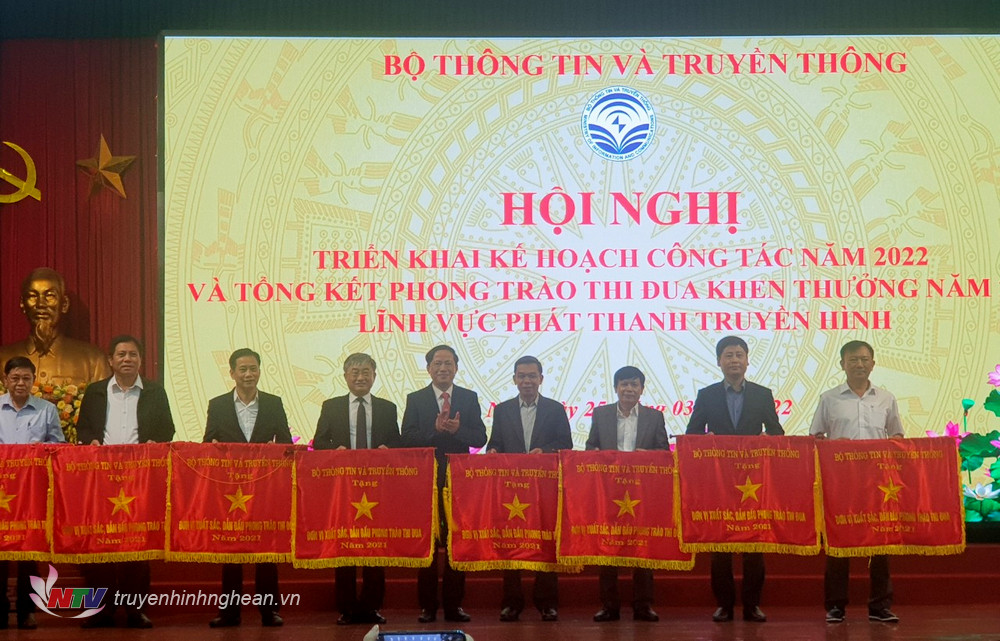 | Thứ trưởng Bộ TT&TT Phạm Anh Tuấn trao Cờ Thi đua của Bộ TT&TT cho NTV vì có thành tích xuất sắc dẫn đầu phong trào thi đua. |