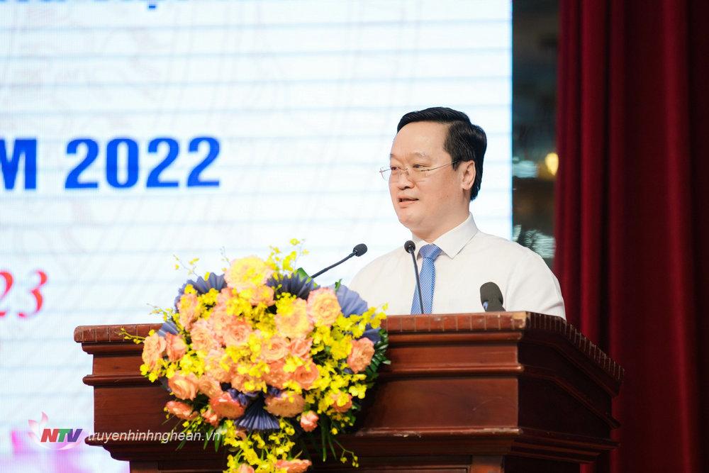 | Đồng chí Trần Minh Ngọc - Giám đốc Đài PT-TH Nghệ An, Chủ tịch Hội nhà báo tỉnh phát biểu tại hội nghị. |