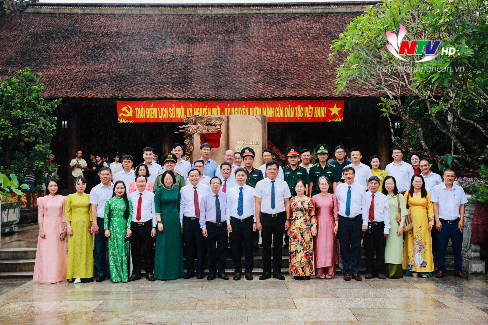 | Đoàn đại biểu Hội Nhà báo tỉnh chụp ảnh lưu niệm tại Khu Di tích Quốc gia đặc biệt Kim Liên. |