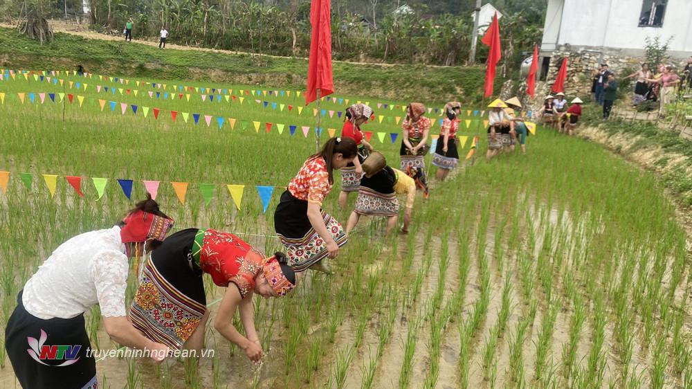 | Nghệ nhân Trương Thị Giáp hướng dẫn học sinh tìm hiểu về loại bánh đặc trưng của đồng báo dân tộc Thổ. |