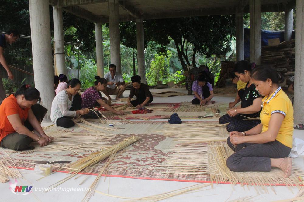 | Bà Vi Thị Hồng (người đầu tiên bên phải) đang đan lát cùng các thành viên trong tổ. |