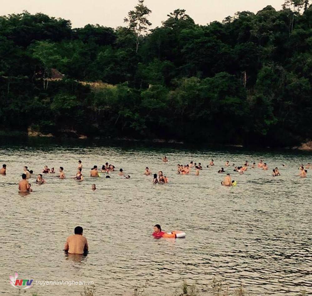 Bắt đầu từ khoảng 17h hàng ngày, các gia đình đưa con ra sông Lam, khu vực dưới thân đập Bara để tắm mát.