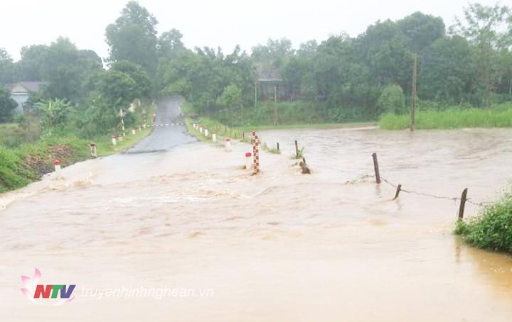 | Đập tràn Khe Mọi trên tuyến đường Lục Dạ đi Môn Sơn nước dâng cao, gây chia cắt giao thông. |