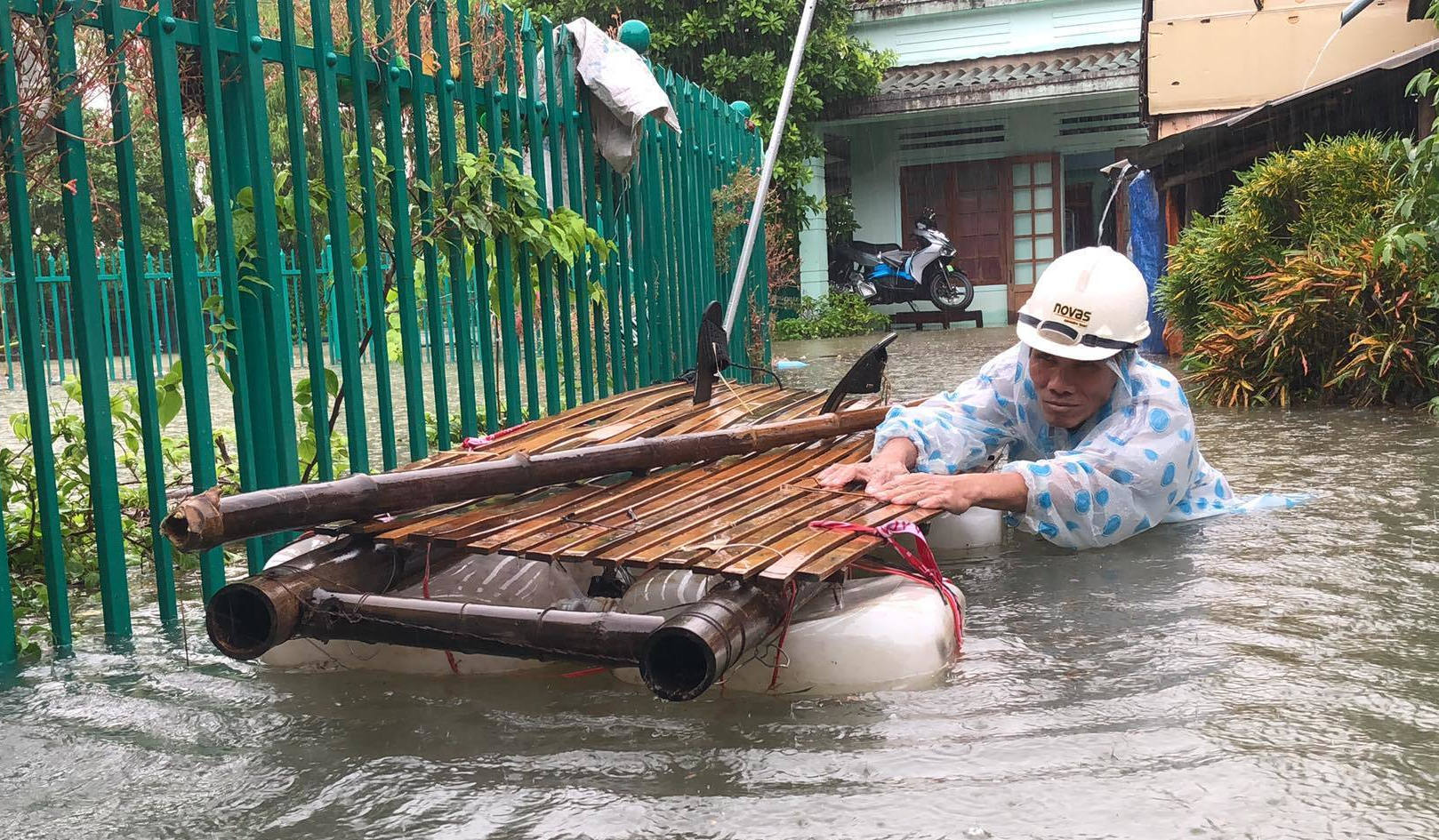 | Nhiều gia đình tất bật dọn dẹp đồ đạc, di chuyển tài sản lên đường Trần Đại Nghĩa để tránh lũ. |