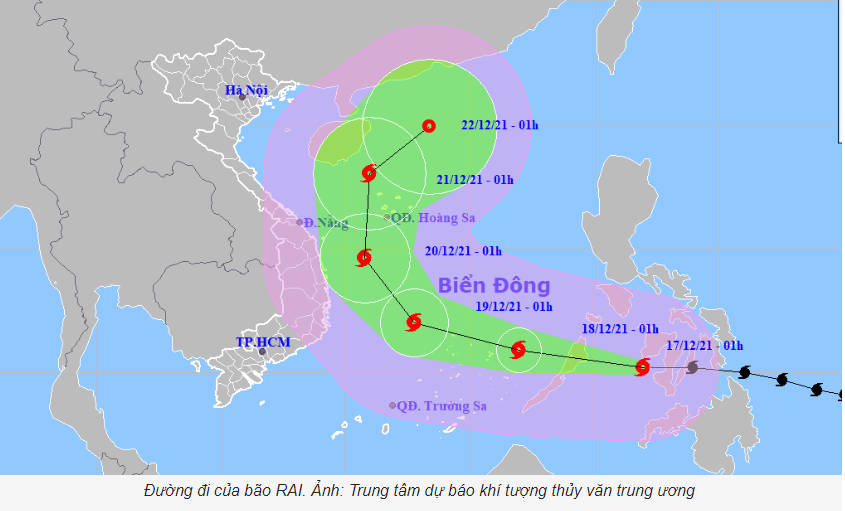 Theo dự báo của Trung tâm Dự báo khí tượng thủy văn Quốc gia, tối ngày 17/12/2021 bão sẽ vào Biển Đông với sức gió mạnh nhất vùng gần tâm bão đạt cấp 13-14, giật cấp 17, gây sóng biển cao từ 6-8 m ở khu vực bắc, giữa và nam Biển Đông; ngày 19 và 20/12, khu vực biển ngoài khơi các tỉnh Trung Bộ có thể có gió mạnh cấp 11-12, giật cấp 14-15; đe dọa trực tiếp đến an toàn của tàu thuyền và các hoạt động trên biển, ven biển.