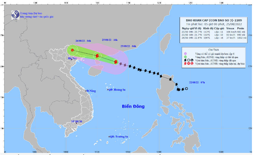 Cảnh báo gió mạnh trên đất liền từ nay đến sáng ngày 26/8, khu vực ven biển tỉnh Quảng Ninh khả năng có gió mạnh cấp 6, giật cấp 8; khu vực Hải Phòng, Lạng Sơn khả năng có gió giật cấp 6-7.