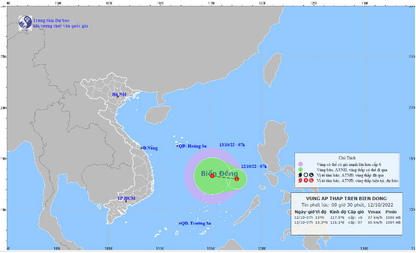 Vào 1 giờ sáng nay, vùng áp thấp vẫn ở trên khu vực giữa Biển Đông. Dự báo trong ngày và đêm nay (13/10), vùng áp thấp di chuyển theo hướng Tây, mỗi giờ đi được khoảng 10km và có khả năng mạnh lên thành áp thấp nhiệt đới.