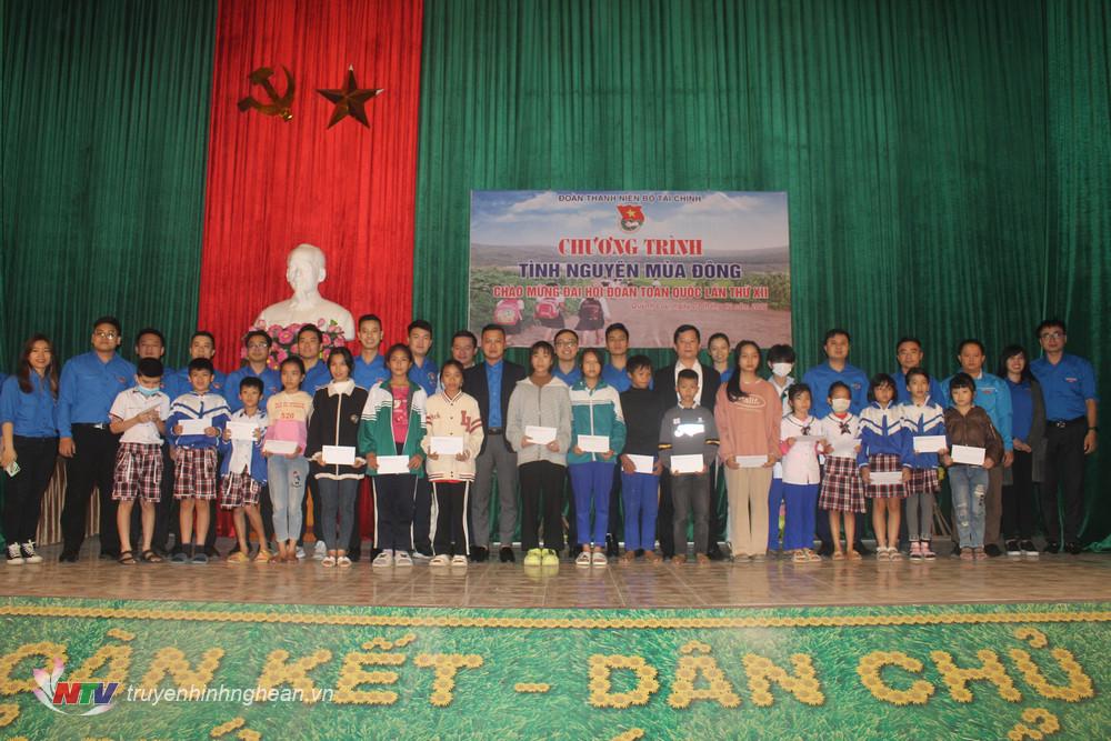 Dịp này, đơn vị phối hợp đoàn Từ thiện Bông lúa vàng (huyện Yên Thành) trao 1.950 suất quà tổng trị giá 240 triệu đồng. Quà gồm: 1.337 áo ấm học sinh; 10 tấn gạo, nhu yếu phẩm; bánh kẹo… cho Nhân dân và học sinh các trường trên địa bàn xã Keng Đu.