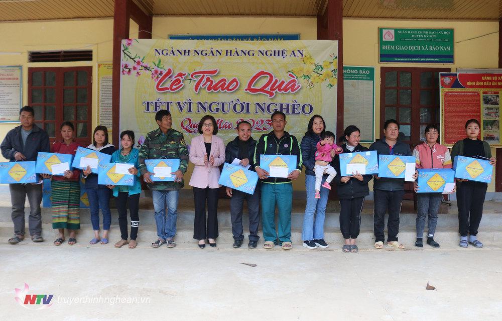 | Chủ tịch UBND huyện Anh Sơn Hoàng Quyền trao quà Tết cho các hộ nghèo. |