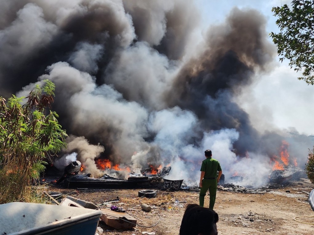 | Lực lượng Công binh Bộ CHQS tỉnh tra lắp đồ dung gây nổ tiến hành kích hoạt huy nổ bom. |