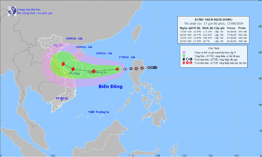 Hồi 4h ngày 19/9, vị trí tâm bão số 4 ở vào khoảng 17,3 độ Vĩ Bắc; 109,8 độ Kinh Đông, cách Đà Nẵng khoảng 217km về phía Đông Bắc, cách Quảng Trị khoảng 260km về phía Đông.