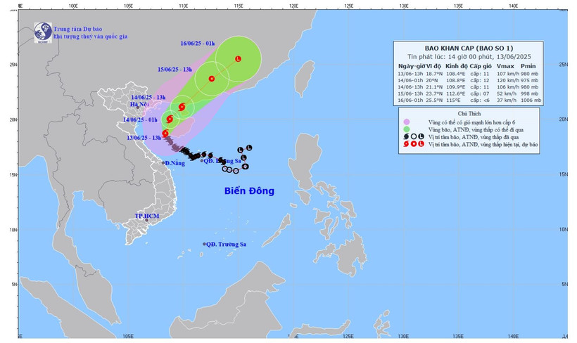| Bản đồ dự báo quỹ đạo và cường độ Bão số 1 lúc 14 giờ ngày 13/6. (Ảnh: Trung tâm Dự báo khí tượng thủy văn quốc gia) |