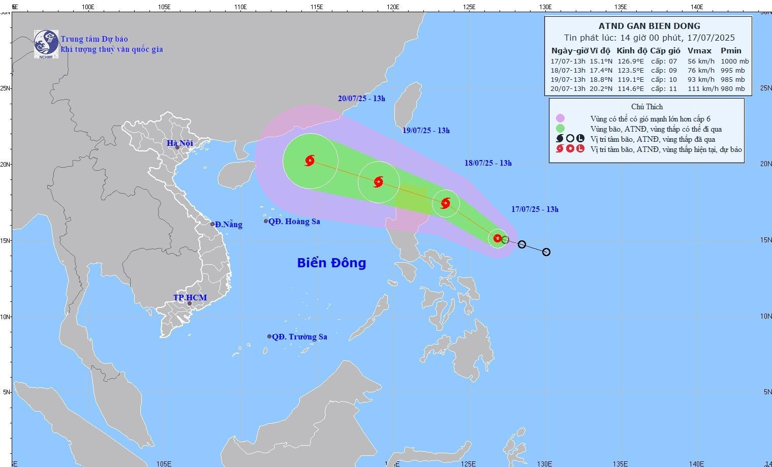 Theo bản tin từ Đài Khí tượng Thủy văn tỉnh Nghệ An, hồi 13 giờ ngày 17/7, vị trí tâm áp thấp nhiệt đới ở khoảng 15,1 độ Vĩ Bắc; 126,9 độ Kinh Đông, trên vùng biển phía Đông Philippines, sức gió mạnh nhất vùng gần tâm ATNĐ mạnh cấp 7, giật cấp 9, di chuyển theo hướng Tây Tây Bắc với tốc độ từ 15-20 km/h; dự báo trong 24 đến 48 giờ tới áp thấp nhiệt đới di chuyển theo hướng Tây Tây Bắc với tốc độ khoảng 20-25 km/h và có khả năng mạnh lên thành bão.