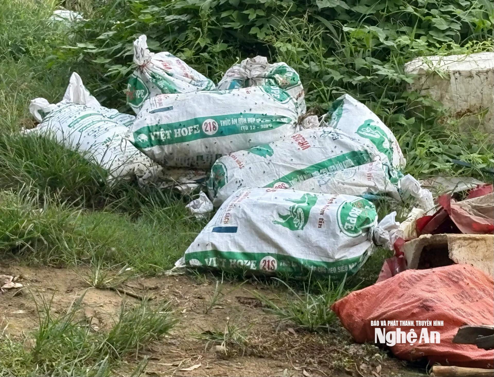 | Nhiều bao bì chứa xác lợn vứt tại các bãi rãc, vườn keo trên địa bàn xã Nghĩa Khánh. |