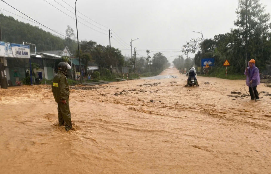 Ghi nhận tại xã Nông Sơn, nước sông Thu Bồn dâng cao khiến toàn tuyến đường tỉnh 611 ngập sâu, giao thông từ chân Đèo Le về trung tâm xã chia cắt hoàn toàn. Lực lượng chức năng đã chốt chặn không cho người và phương tiện đi qua.