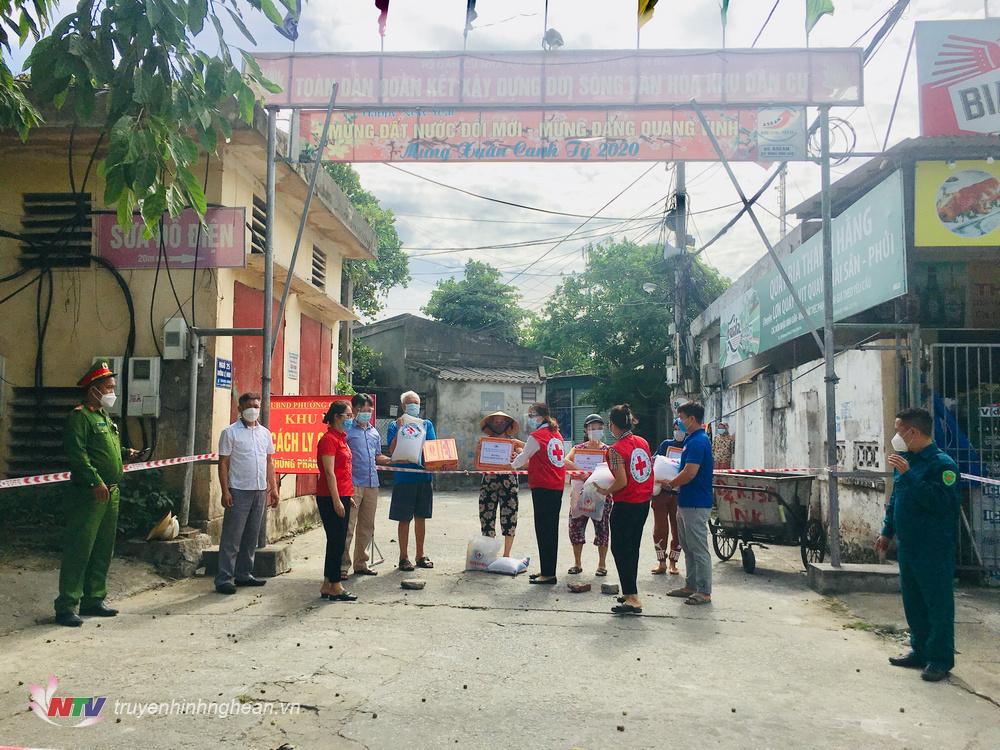 | Hội chữ thập đỏ tỉnh trao hỗ trợ gia đình công nhân đang ở trọ trong khu vực phong toả tại xã Hưng Đông, TP Vinh. |