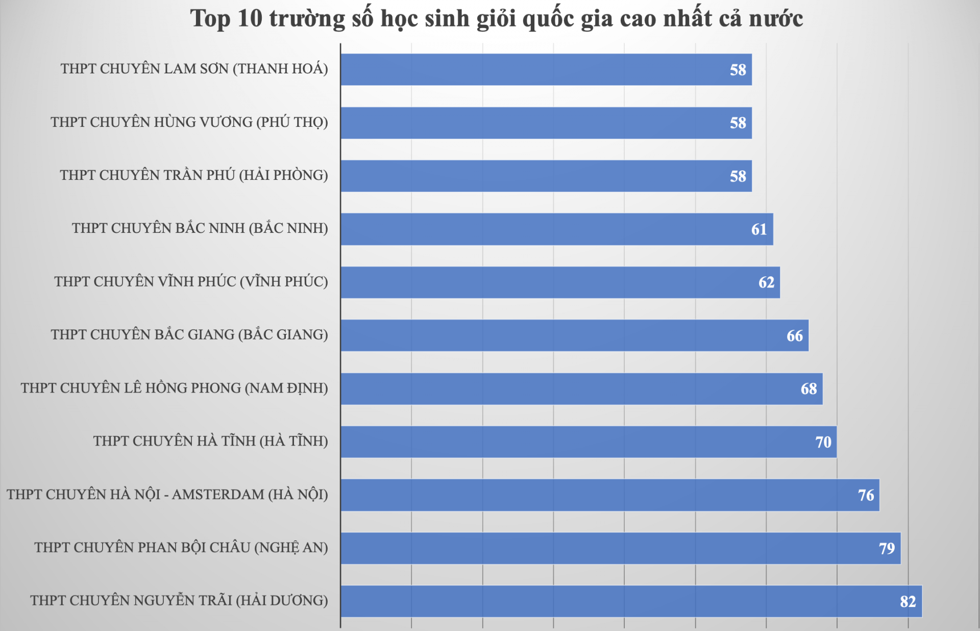 Kỳ thi chọn học sinh giỏi quốc gia THPT năm 2022 có 4.671 thí sinh dự thi 12 môn. Kết quả, 2.225 thí sinh đoạt giải, trong đó Hà Nội dẫn đầu với 125 em (tính cả các trường THPT chuyên), Hải Phòng 85 em, Hải Dương 82, Nghệ An 79 em.