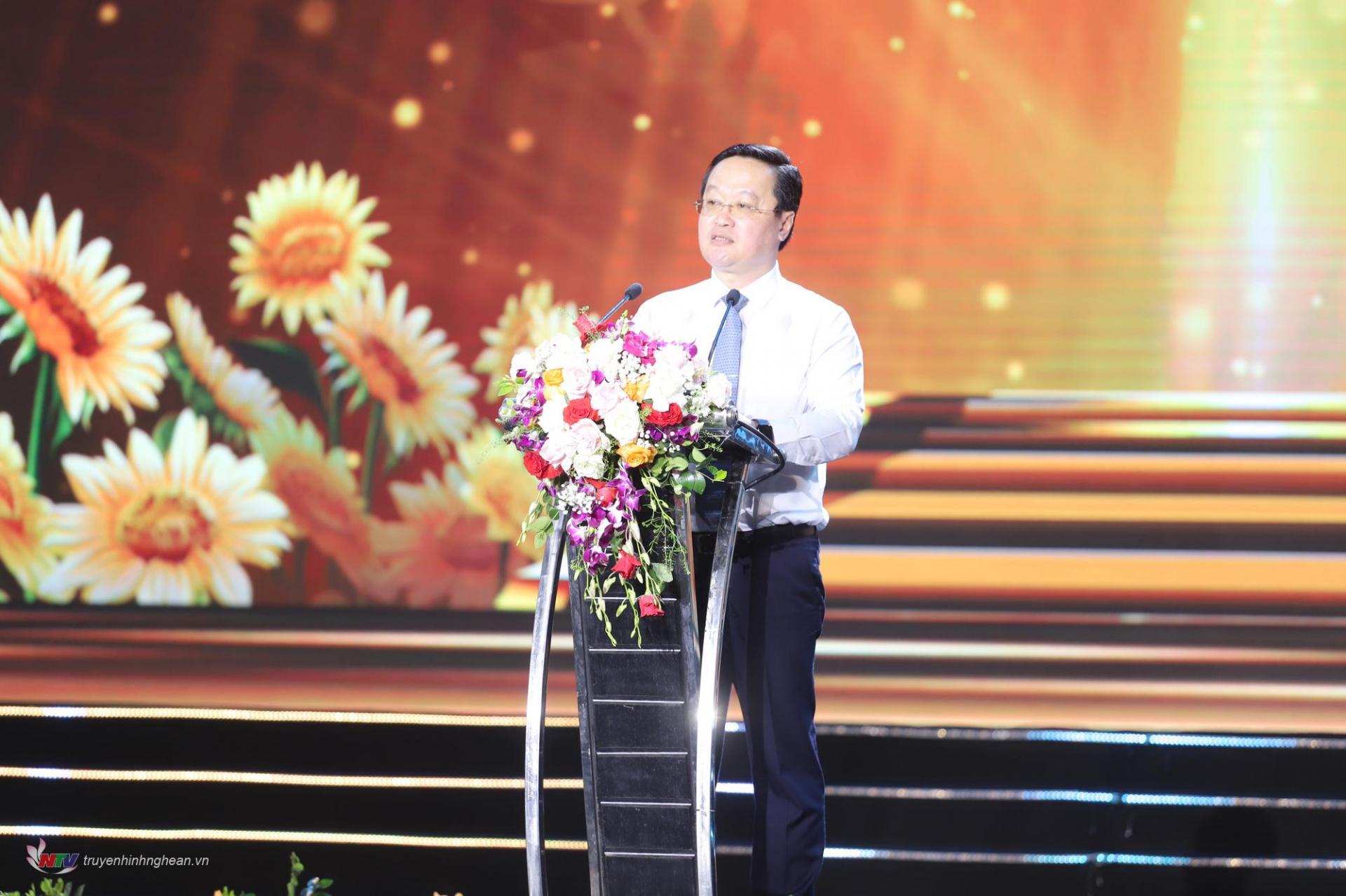 | Đồng chí Trần Minh Ngọc - Giám đốc Đài PT-TH Nghệ An, Chủ tịch Hội nhà báo tỉnh và đồng chí Nguyễn Văn Khoa- Phó Giám đốc Sở Giáo dục - Đào tạo trao vòng nguyệt quế, cup và phần thưởng cho Quán quân English Challenge mùa 7. |