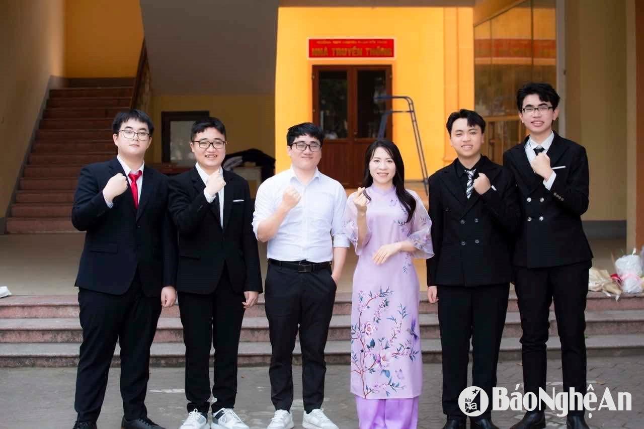 | Học sinh Nguyễn Ngô Đức (ngoài cùng bên trái) cùng thầy cô đội tuyển, chủ nhiệm lớp 12A4 và các thành viên đội tuyển Hóa học của Trường THPT chuyên Phan Bội Châu. Ảnh: NTCC |