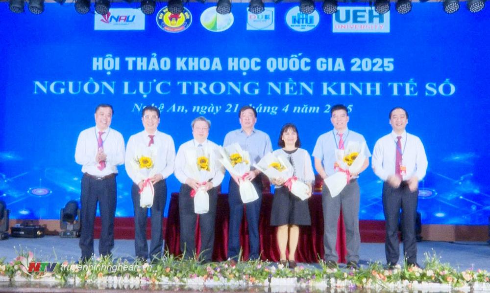 | Hiệu trưởng Trường Đại học Nghệ An tặng hoa cho các đơn vị đồng tổ chức hội thảo. |