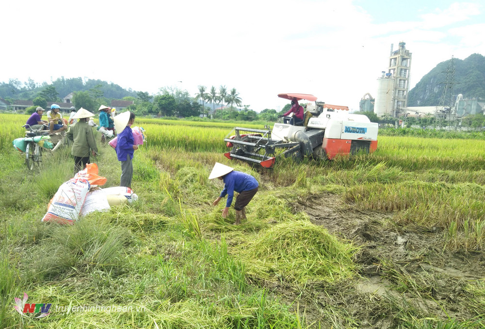 | Nông dân Nghĩa Khánh đưa cơ giới hóa vào thu hoạch lúa đông – xuân. |