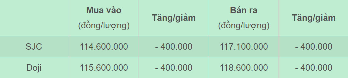Tương tự, giá vàng nhẫn loại 1-5 chỉ của SJC niêm yết ở mức 115-117,5 triệu đồng/lượng (mua - bán), không đổi. Giá vàng nhẫn 9999 tại Doji chốt phiên ở mức 116-119 triệu đồng/lượng, cũng giữ nguyên so với cuối tuần trước.