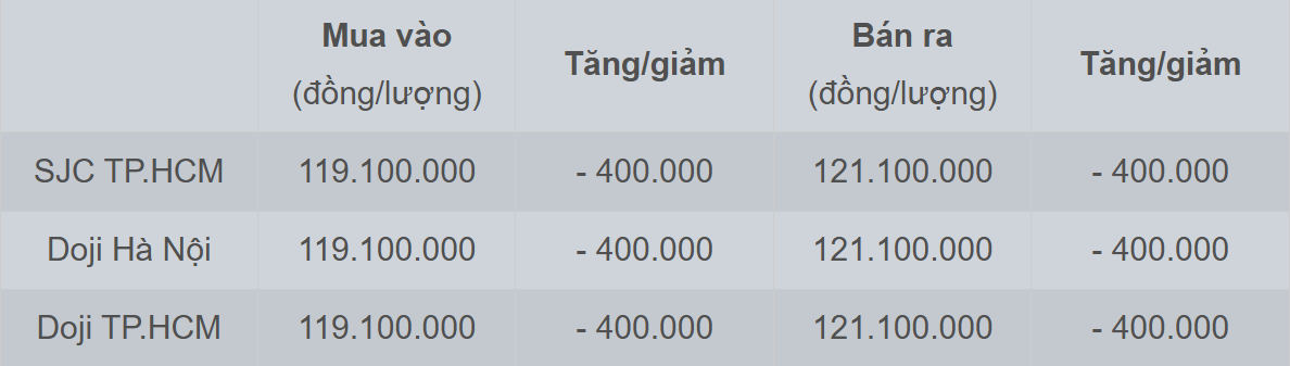 Sáng 15/7, giá vàng 9999 của SJC hạ 400 nghìn đồng/lượng ở cả chiều mua vào và bán ra so với kết phiên giao dịch hôm qua, xuống mức 119,1-121,1 triệu đồng/lượng (mua vào - bán ra).