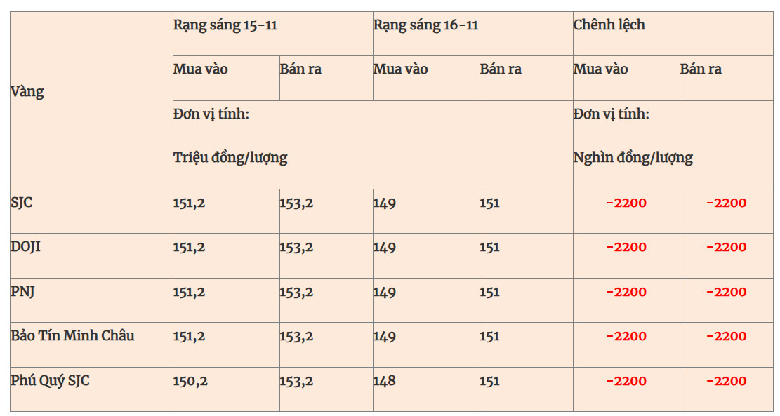 Giá vàng miếng trong nước cập nhật lúc 5 giờ sáng 16-11 như sau:
