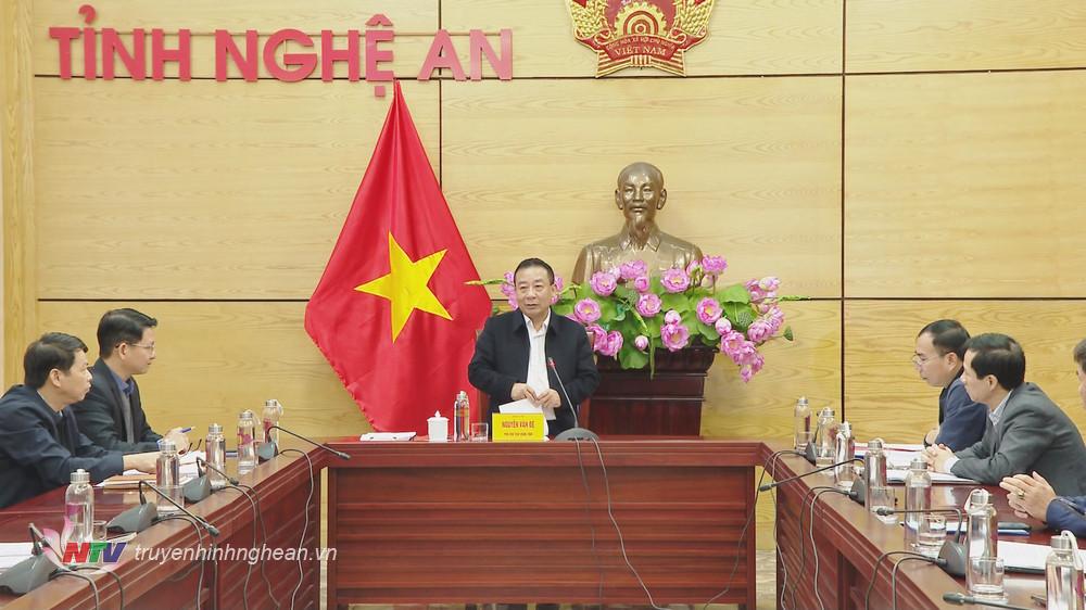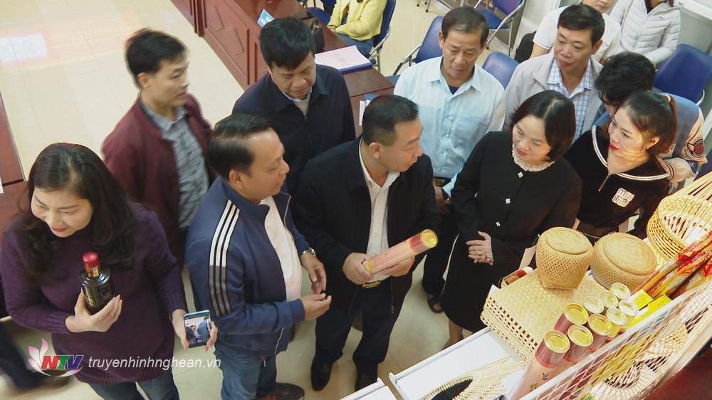 | Các đại biểu tỉnh và huyện tham quan gian hàng nông sản của xã Nghĩa Thọ |