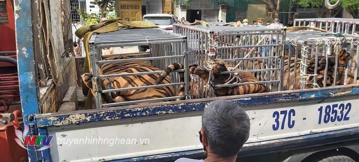 | Cho những cá thể hổ này vào lồng sắt để vận chuyển đưa đi chăm sóc. |