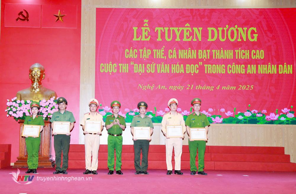 | Đại tá Trần Ngọc Tuấn, Phó Giám đốc Công an tỉnh trao Giấy khen cho các tập thể, cá nhân đạt thành tích xuất sắc tại Cuộc thi “Đại sứ văn hóa đọc” trong Công an nhân dân. |
