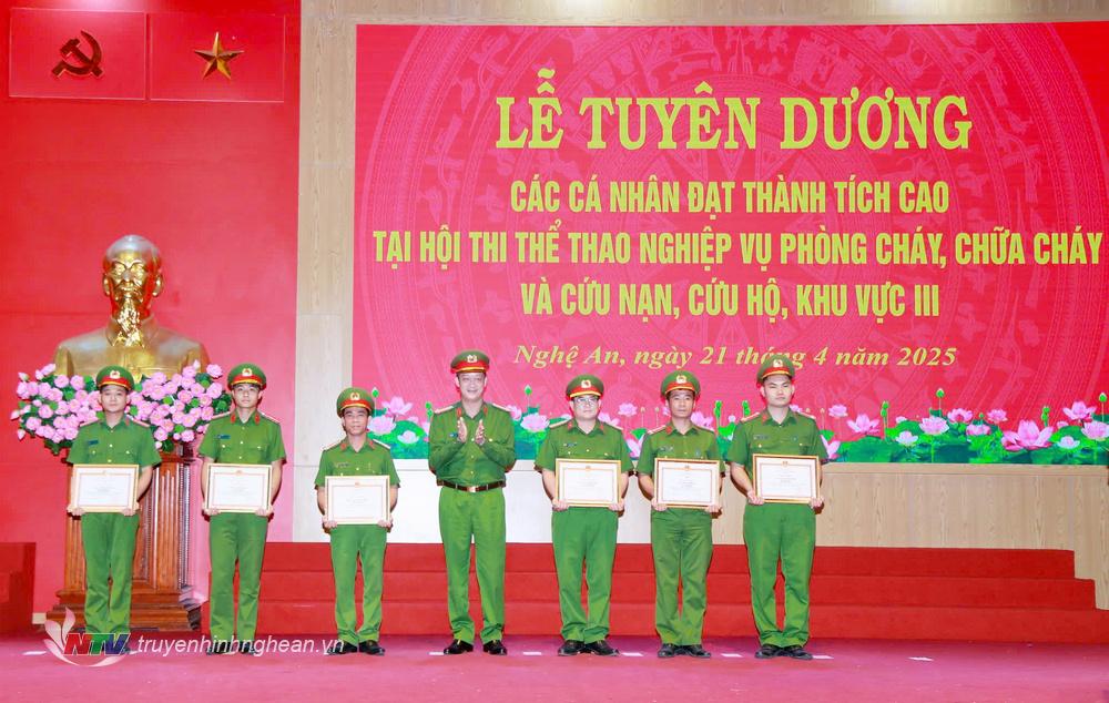 | Đại tá Nguyễn Đức Cường, Phó Giám đốc Công an tỉnh trao Giấy khen cho các cá nhân có thành tích xuất sắc tại Hội thi thể thao nghiệp vụ chữa cháy và cứu nạn, cứu hộ Vòng thi thứ 2 - Khu vực III. |