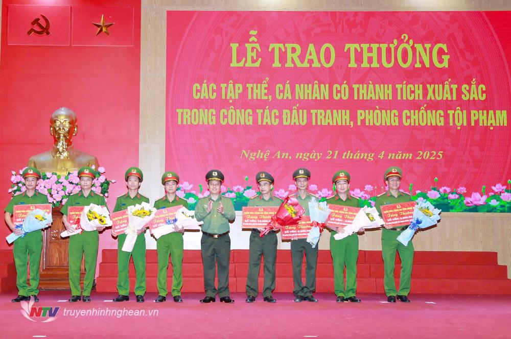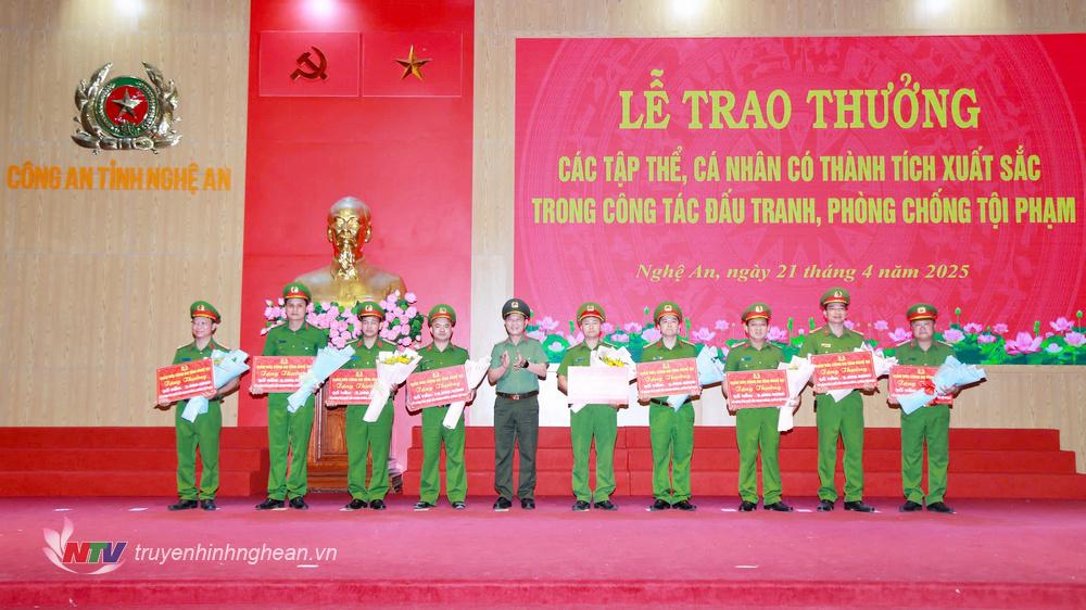 | Đại tá Lê Văn Thái, Phó Giám đốc, Thủ trưởng Cơ quan An ninh điều tra Công an tỉnh trao thưởng các tập thể đạt thành tích xuất sắc trong công tác đấu tranh phòng, chống tội phạm. |