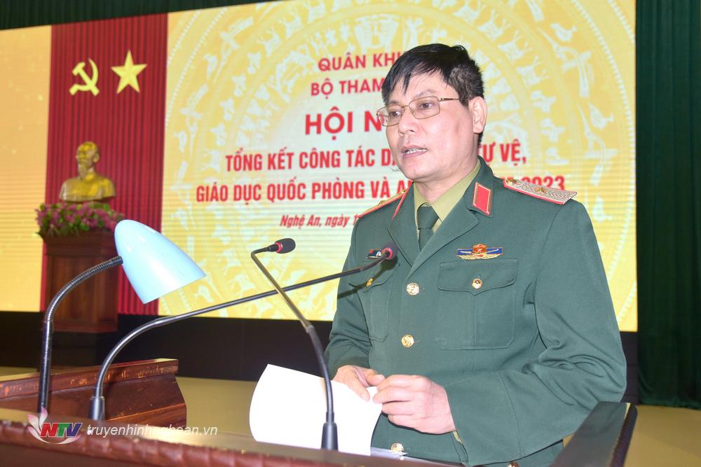 | Trung tướng Dương Văn Thăng, Phó Chánh án Toà án nhân dân tối cao, Chánh án Toà án quân sự Trung ương phát biểu chỉ đạo hội nghị. |