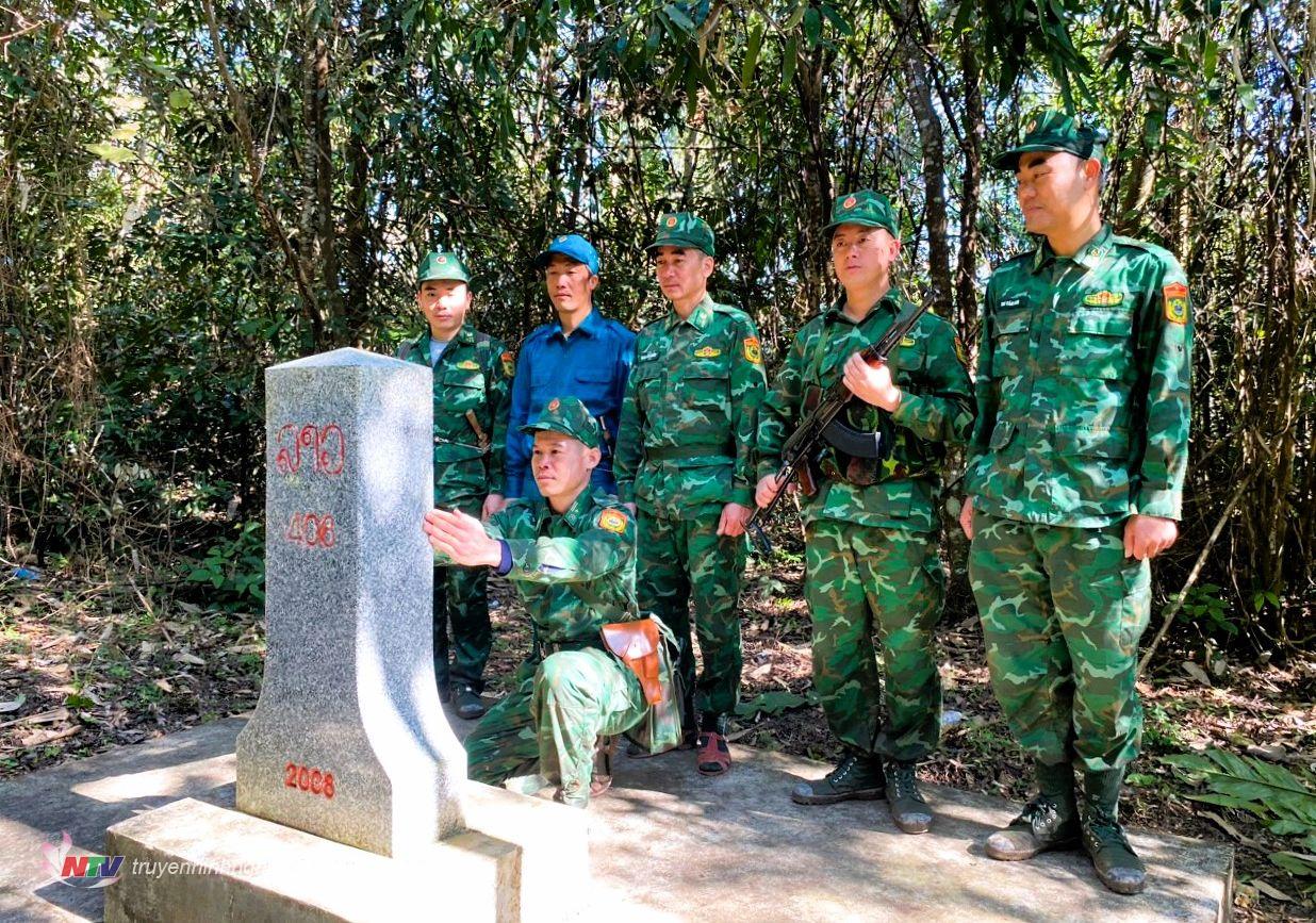 | Đội hình tuần tra Đồn Biên phòng cửa khẩu quốc tế Nậm Cắn và dân quân địa phương thực hiện nghi thức chào cột mốc chủ quyền biên giới Việt Nam - Lào |