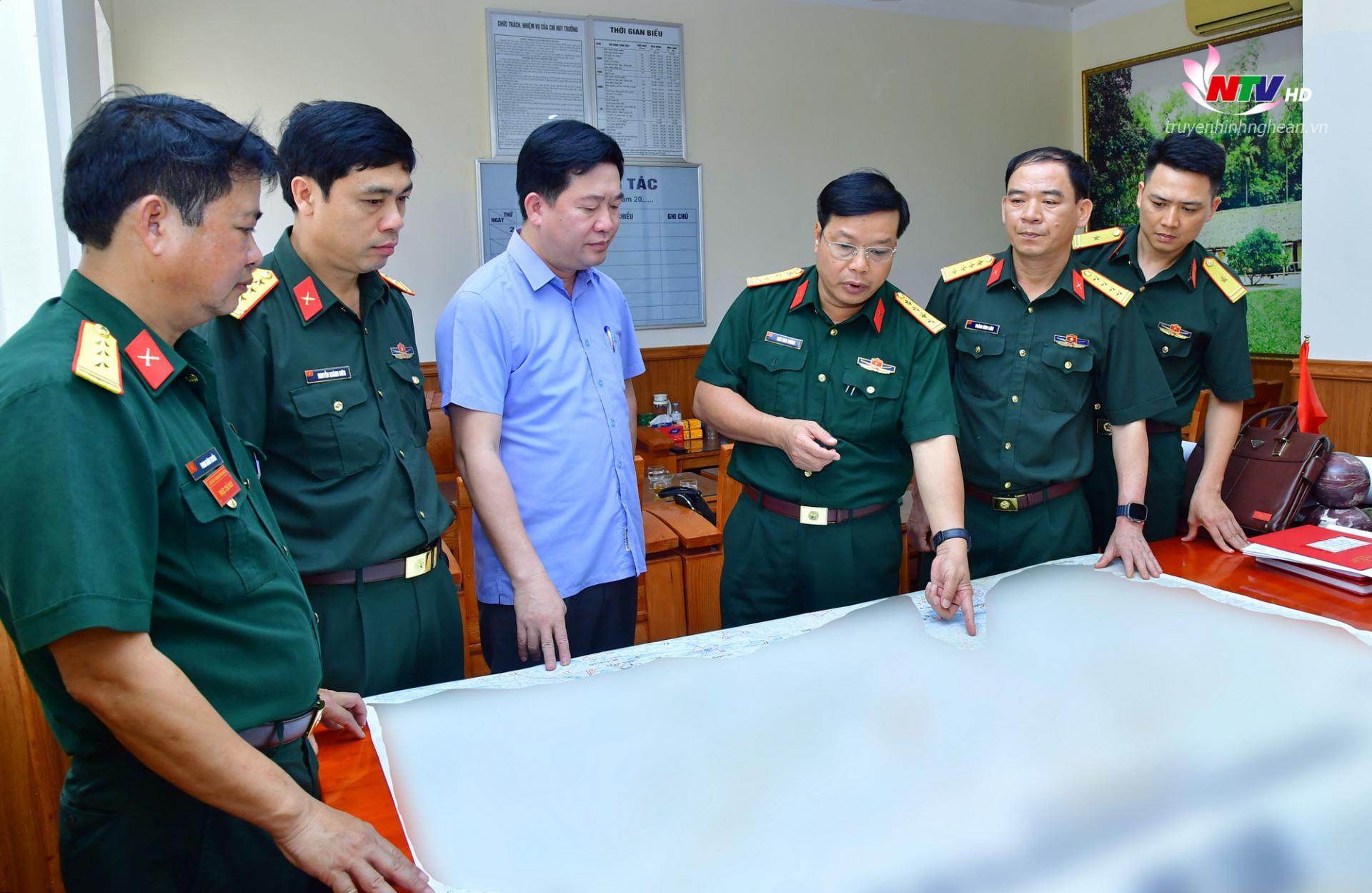 | Thủ trưởng Bộ Tư lệnh Quân khu và lãnh đạo tỉnh Nghệ An thăm hỏi, động viên lực lượng tham gia diễu binh. |
