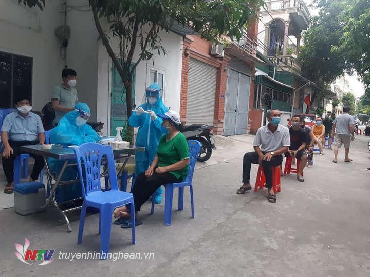 | Trung tâm Y tế TX Hồng Lĩnh khẩn trương lấy mẫu xét nghiệm cho người dân trong khu vực phong tỏa. |