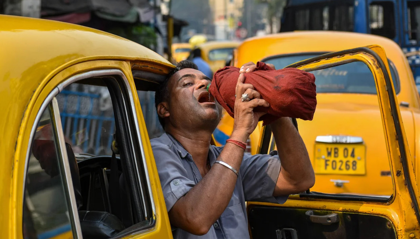 | Một tài xế taxi uống nước từ chai trong cái nóng buổi trưa ở Kolkata, Ấn Độ, vào ngày 18/4. Ít nhất 13 người thiệt mạng ở Ấn Độ vì say nắng sau khi tham dự một sự kiện trên cánh đồng trống không có mái che vào cuối tuần vừa qua. (Ảnh: Getty) |