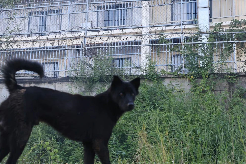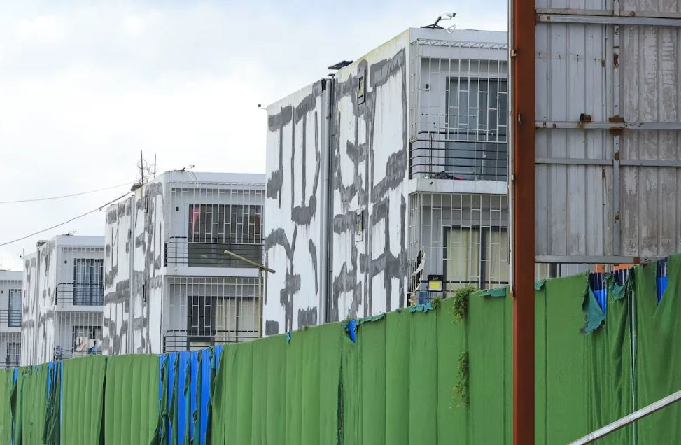 Xung quanh khu nhà dựng các tấm kim loại, trong khi cột chắn lắp ở lối vào.