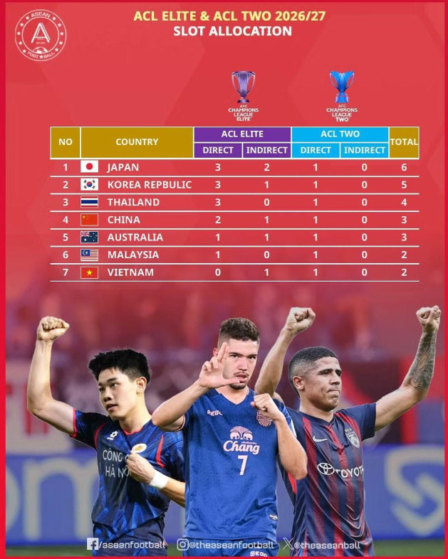 Đáng chú ý, bóng đá Việt Nam nằm trong nhóm được hưởng lợi trực tiếp từ sự thay đổi này. Cụ thể, các CLB V.League sẽ có tổng cộng 2 suất dự cúp châu Á, bao gồm 1 suất tham dự vòng play-off của AFC Champions League Elite và 1 suất vào thẳng AFC Champions League 2 (Cúp C2 châu Á).