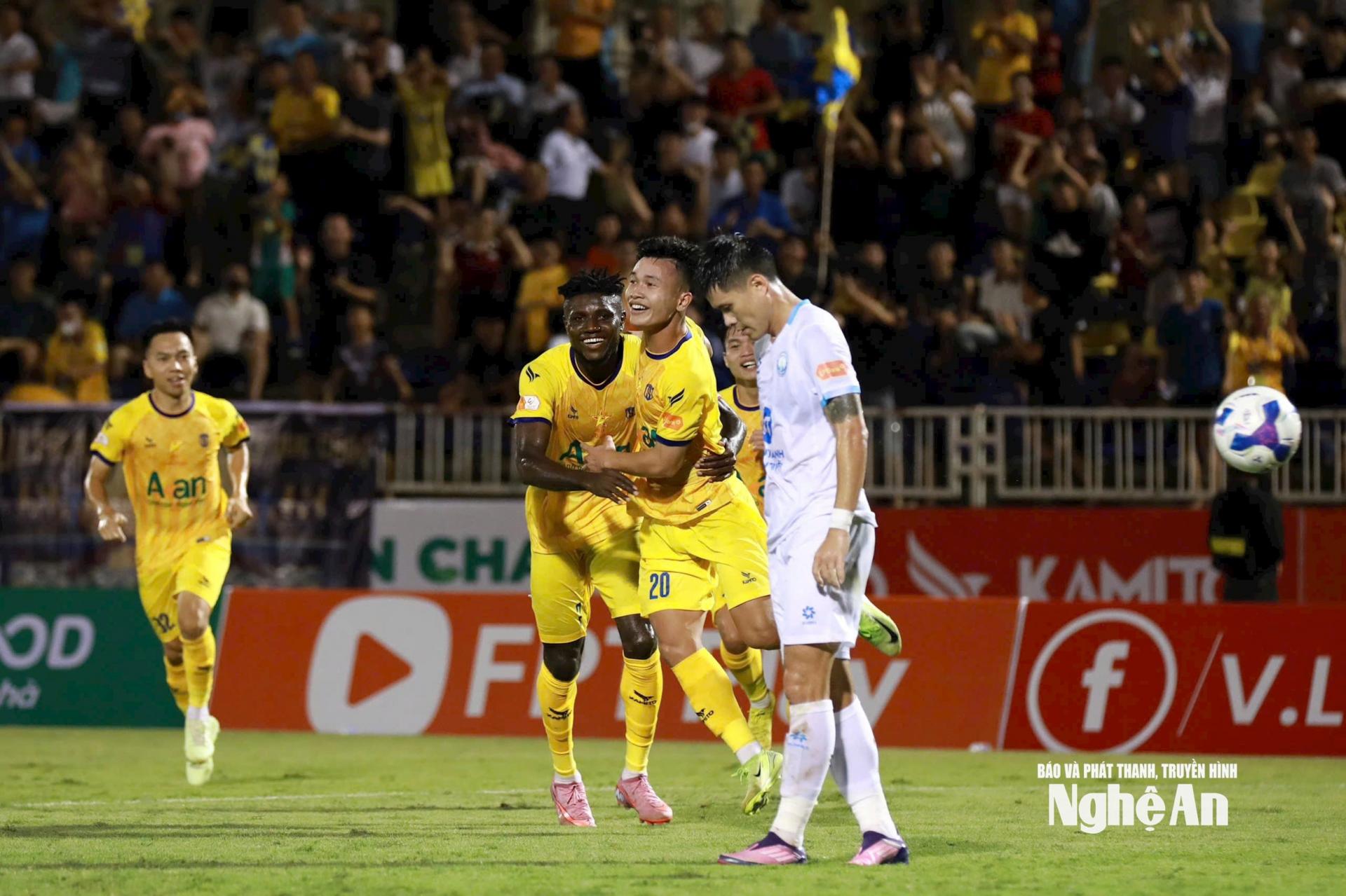 | Các cầu thủ SLNA ăn mừng khi mở tỷ số trận đấu. Ảnh: SLNA |