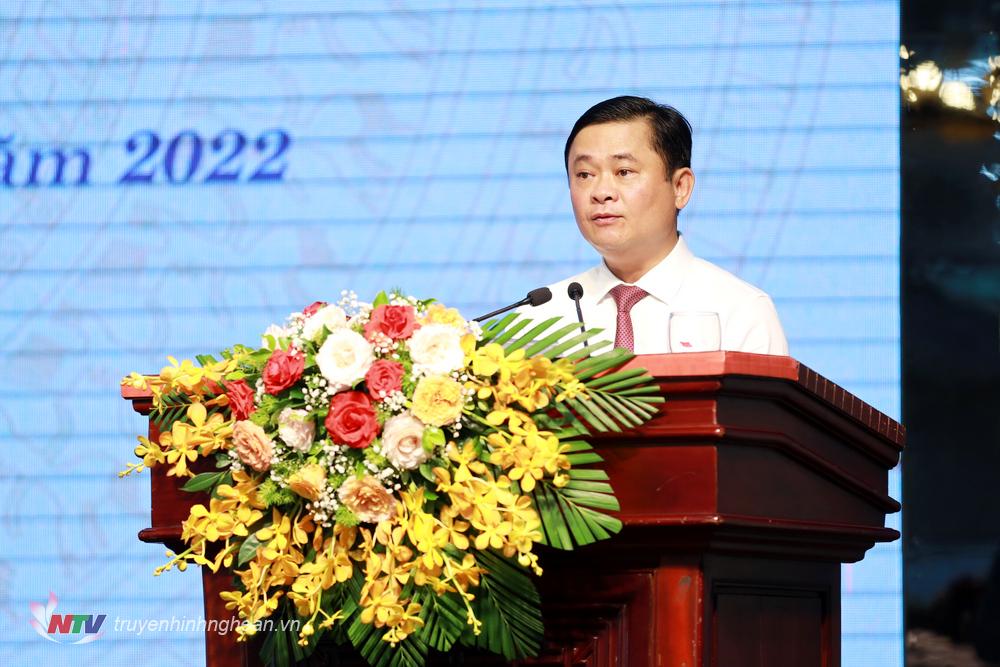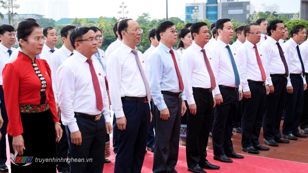 | Đồng chí Thái Thanh Quý, Chủ tịch HĐND tỉnh và đồng chí Nguyễn Đức Trung - Phó Bí thư Tỉnh ủy, Chủ tịch UBND tỉnh tặng hoa đồng chí Lê Đình Lý và đồng chí Nguyễn Viết Hưng. |
