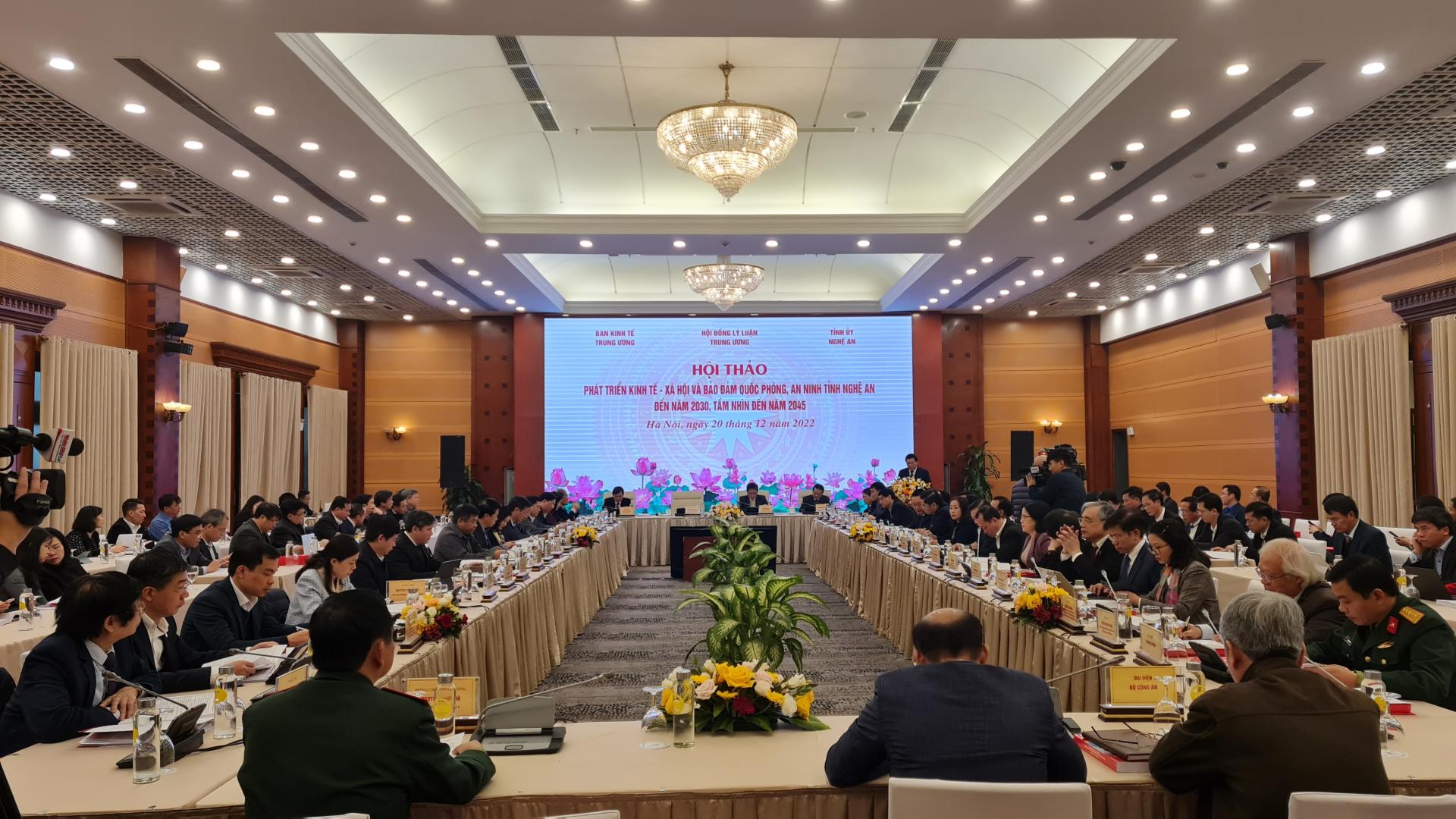 Hôm nay, Ban kinh tế Trung ương, Hội đồng Lý luận Trung ương và Tỉnh uỷ Nghệ An phối hợp tổ chức hội thảo khoa học: Phát triển kinh tế-xã hội và bảo đảm quốc phòng, an ninh tỉnh Nghệ An đến năm 2030, tầm nhìn đến năm 2045, nhằm nhìn lại 10 năm thực hiện Nghị quyết số 26, đề xuất những chủ trương, định hướng và giải pháp phát triển Nghệ An nhanh và bền vững, phấn đấu đến năm 2025 trở thành tỉnh khá trong khu vực phía Bắc, đến năm 2030, trở thành tỉnh khá của cả nước, xác định tầm nhìn phát triển đến năm 2045, thực hiện thắng lợi nghị quyết Đại hội Đảng bộ lần thứ XIX của tỉnh, góp phần thực hiện thắng lợi nghị quyết Đại hội lần thứ XIII của Đảng.