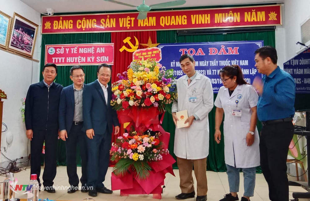 | Bí thư Tỉnh uỷ Thái Thanh Quý cùng đoàn công tác của tỉnh tặng hoa chúc mừng cán bộ, nhân viên Sở Y tế nhân ngày Thầy thuốc Việt Nam 27/2. |